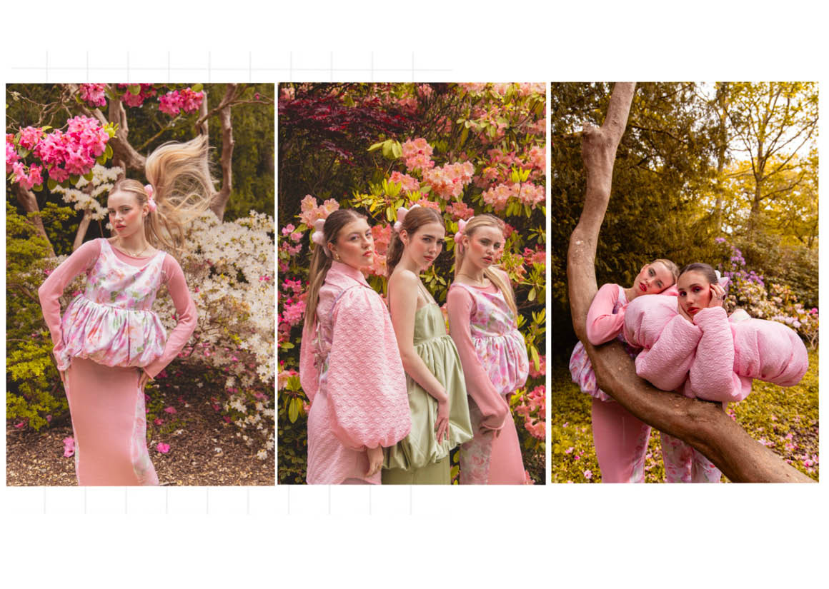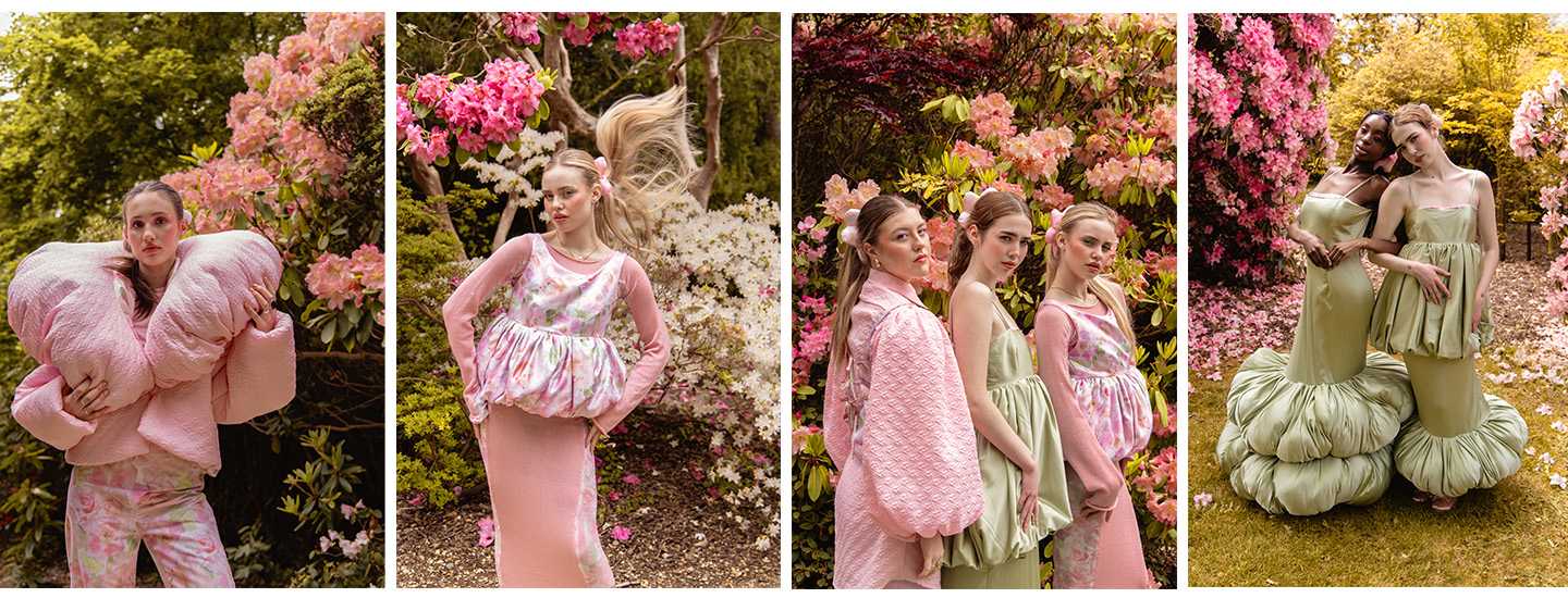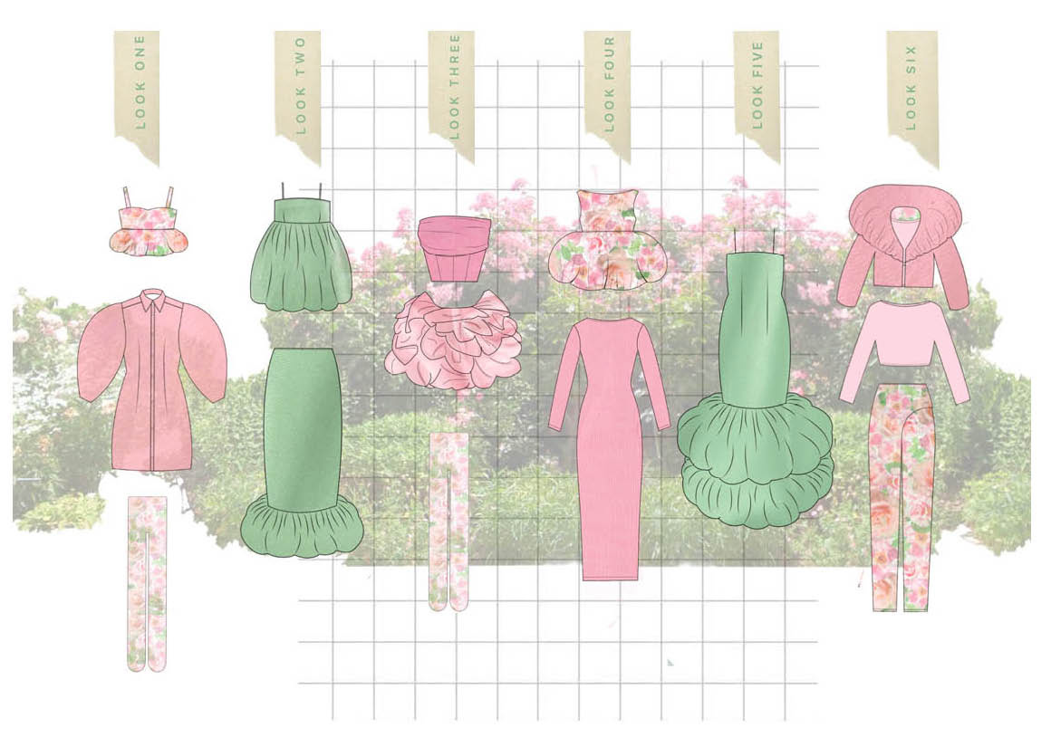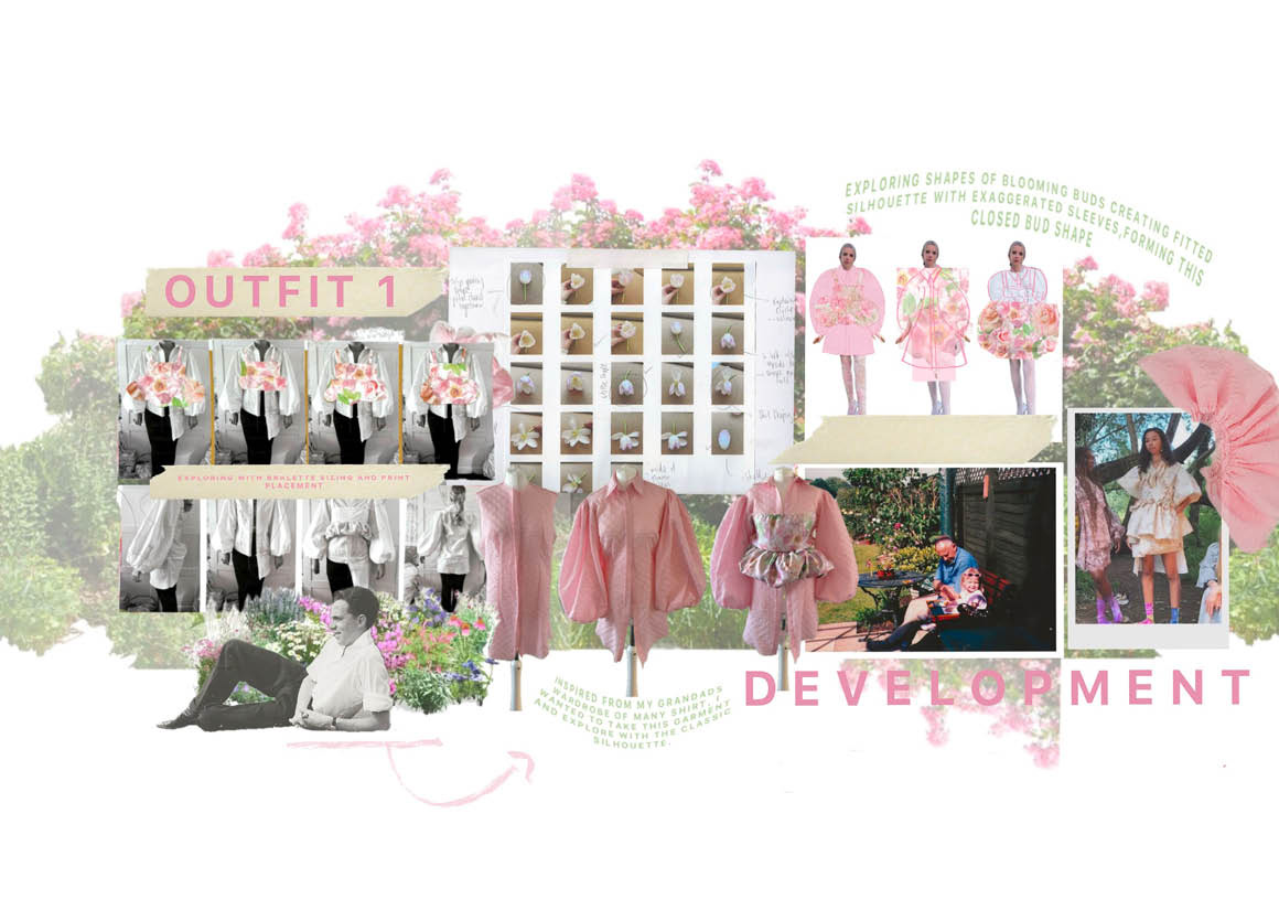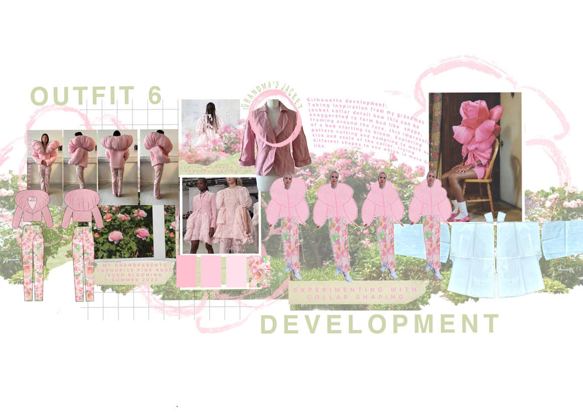 I was captured by the colours and the beauty of a single rose; seeing the bud form and develop to reveal the delicate petals. My grandad would take photographs of every rose in the garden every year. These rose shapes became the main inspiration for the silhouette within the collection. Trying to echo the rose petals and layers. My aim is for the collection to be a gateway, allowing them to step into the garden and to be surrounded by its beauty.