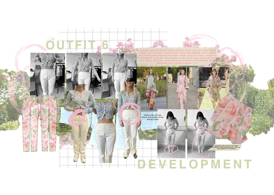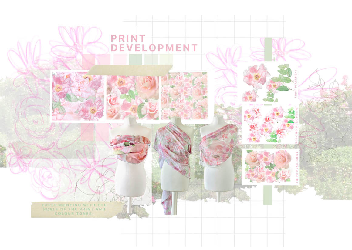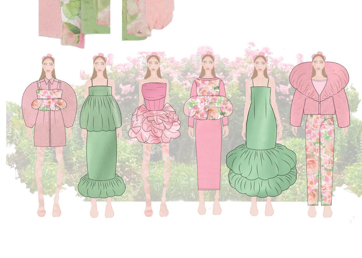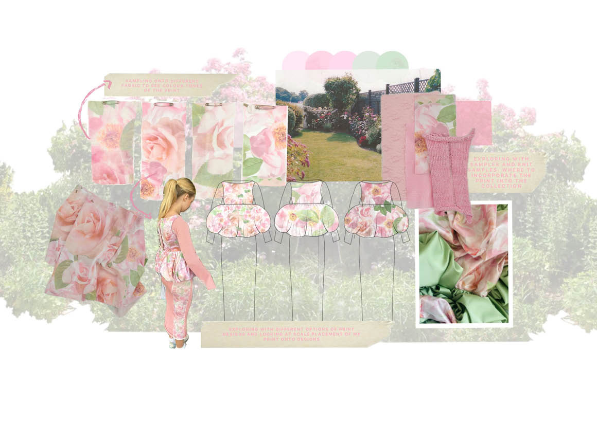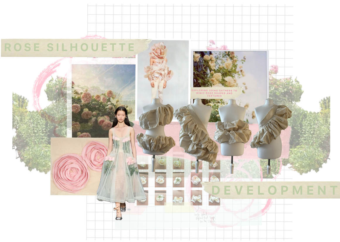 Every finer detail of the collection I want to echo the true beauty of the garden. Through the choice of fabric it was important to me to have textural fabric based creating depth in the collection but also reflecting the many textures surrounding the garden, from this I wanted to create my own print which captured the roses within the garden. My print explores the rose cycle from delicate buds unfurling into beautiful blooming roses portraying the life cycle of growth which echoes through family memory. The complexity of a single rose bloom became the main focus for my silhouette development too. I explored fabric manipulation to create depth within the collection. Using exaggerated gathers and shapes as a main element to mimic the organic shapes and lines of the rose stems and buds. Having layered garments with contrasting striking shapes highlights this silhouette.