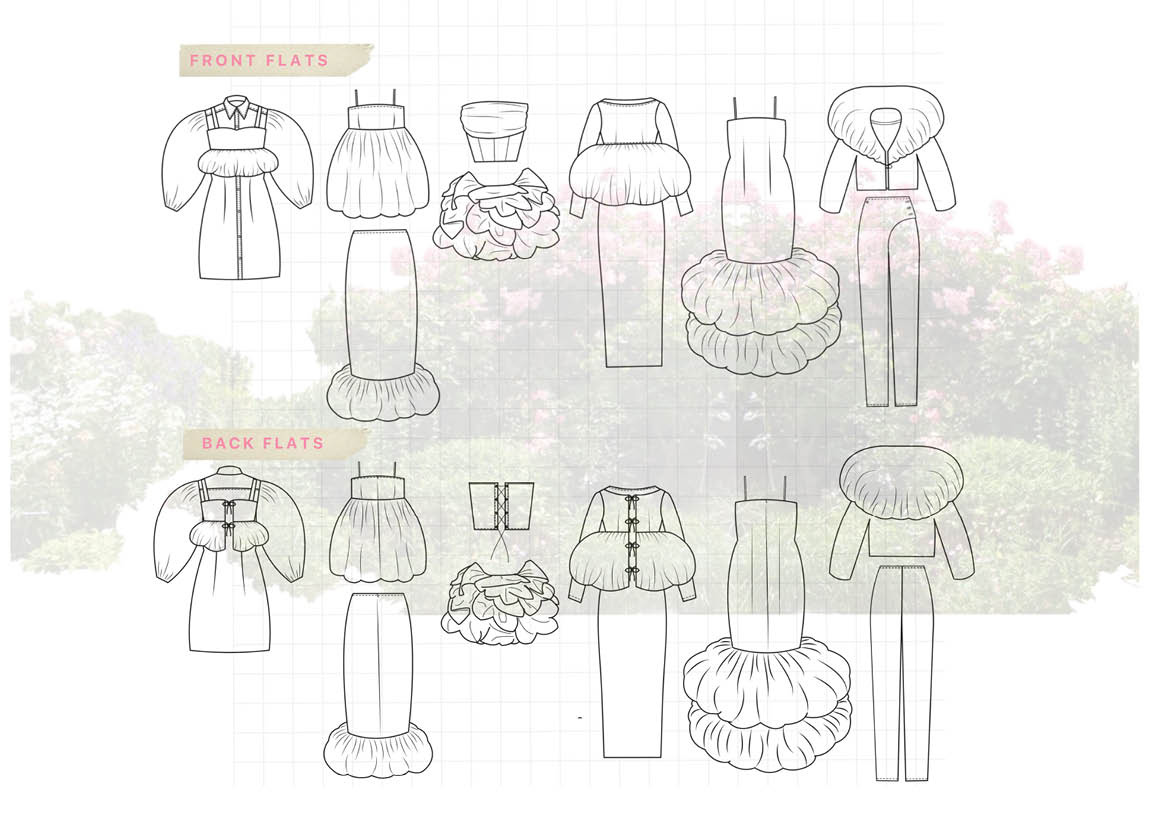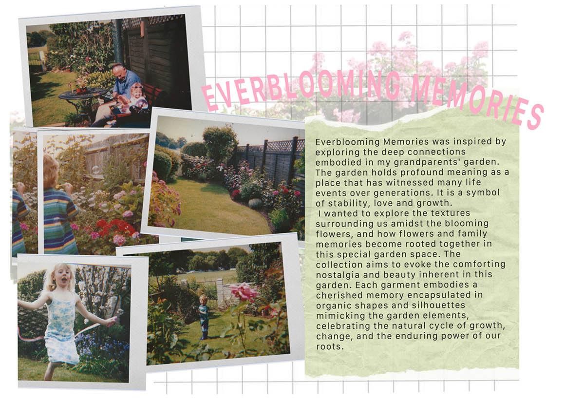 The garden holds profound meaning as a place that has witnessed many life events over generations. It is a symbol of stability, love and growth. Exploring the textures surrounding us amidst the flowers, and how family memories become rooted together here. The collection aims to evoke the comforting nostalgia and beauty inherent in this garden. Each garment embodies a cherished memory encapsulated in organic shapes and silhouettes mimicking the garden elements, celebrating the natural cycle of growth.