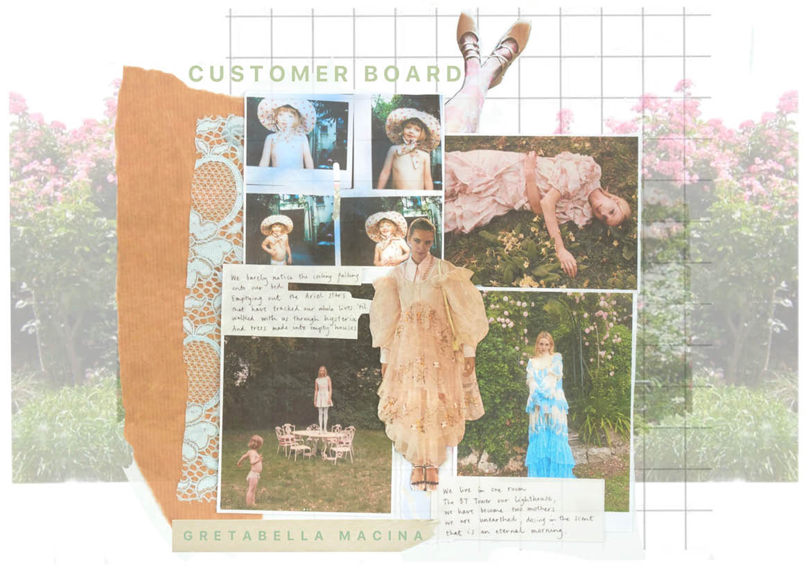 My creative process is intimately intertwined with my personal experiences and cherished memories. I immerse myself fully, allowing emotions and nostalgic connections to guide my artistic journey. Primary research through family photographs, and my own personal memories have enhanced my design development. As a highly tactile designer with an editorial eye, I engage heavily in the design process through sampling, sketching, and collaging with fabrics and silhouettes, allowing concepts to unfold intuitively.