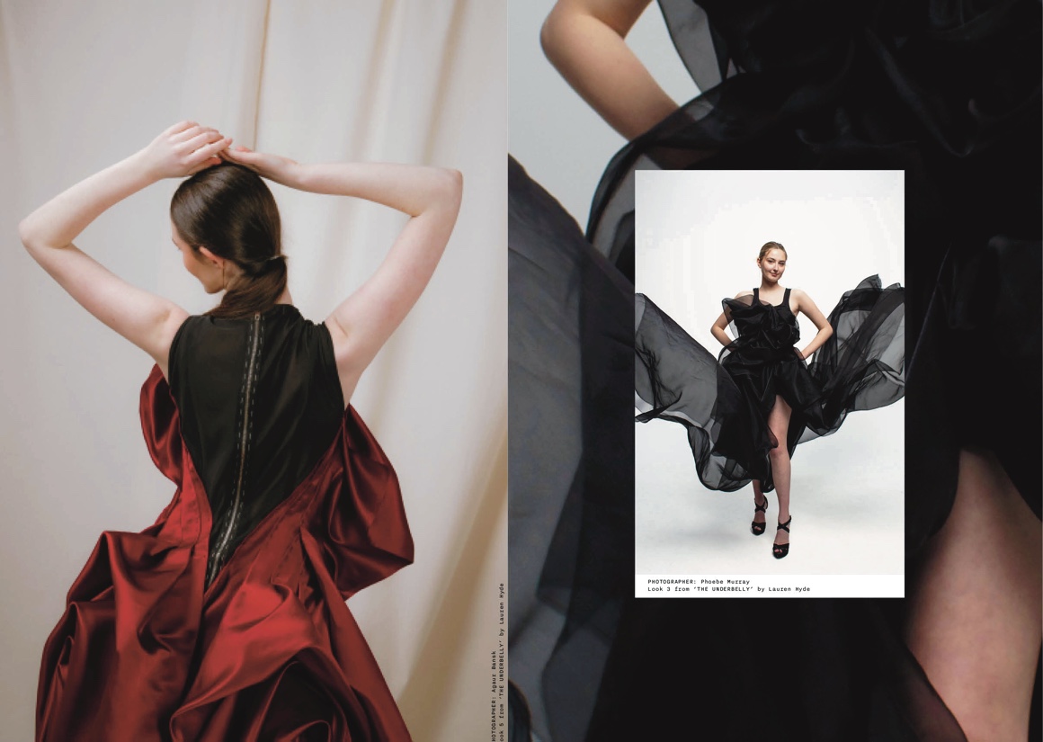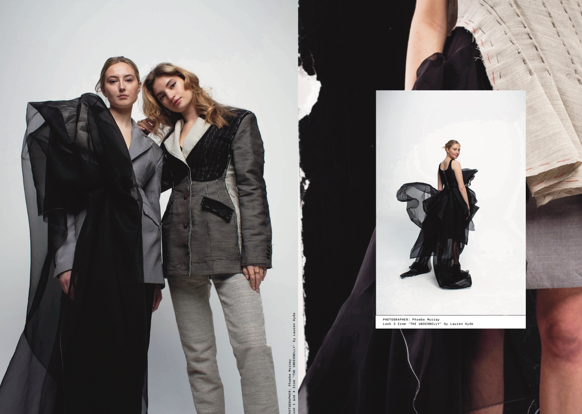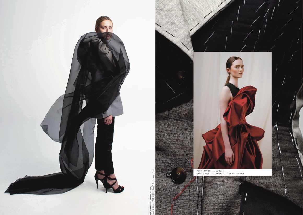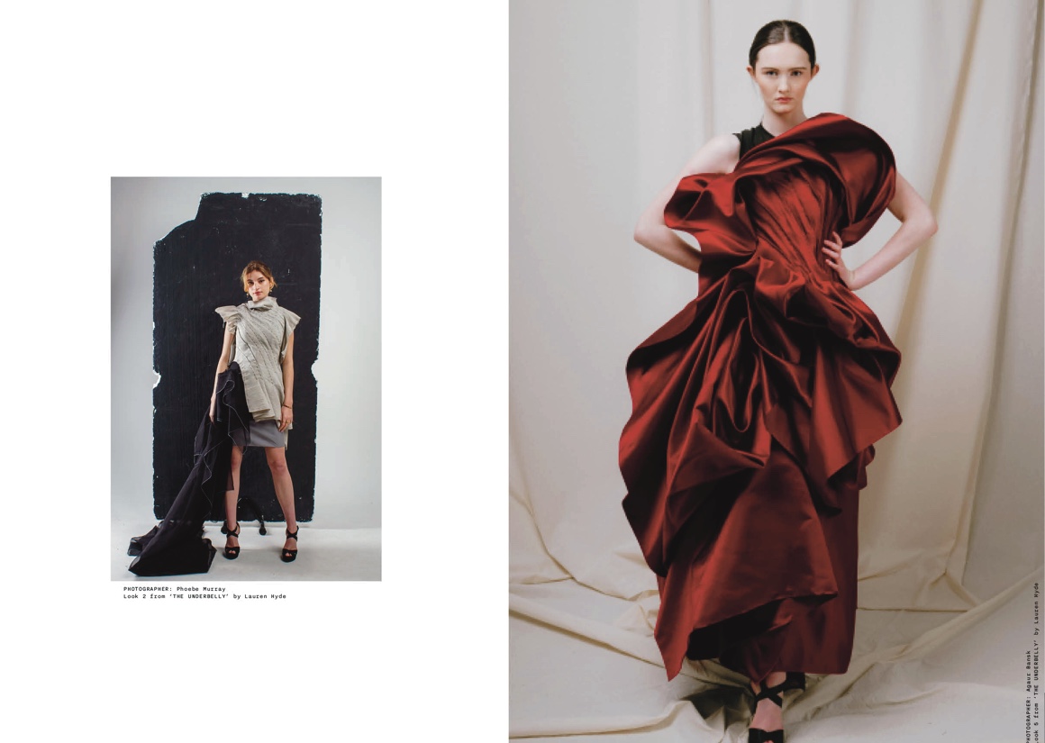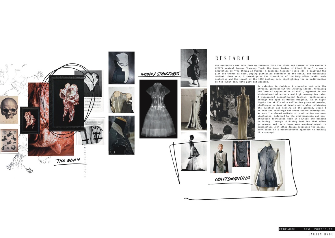 THE UNDERBELLY was born from my research of ‘The String of Pearls: A Domestic Romance’ and its movie adaptation ‘Sweeney Todd: The Demon Barber of Fleet Street’. I investigated dissection of the body, body snatching and the impact of the 1832 Anatomy act, highlighting the co-modification of the human body both past and present. In relation to fashion, I dissected physical garments and the industry, revealing a loss of appreciation of skill, apparent in our mistreatment of workers and high consumption.