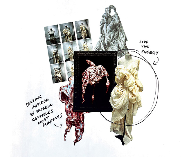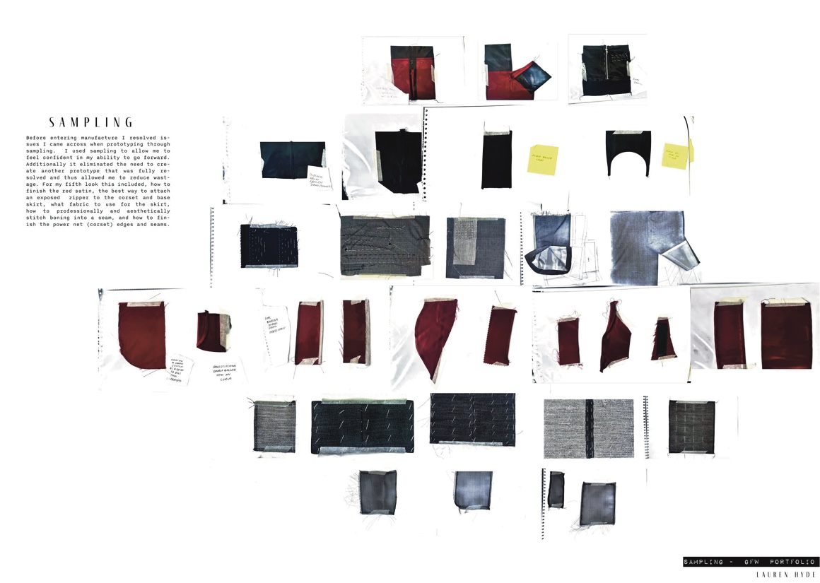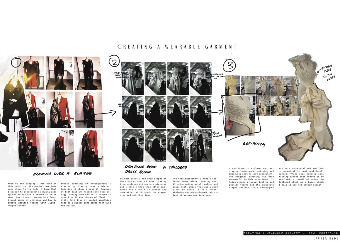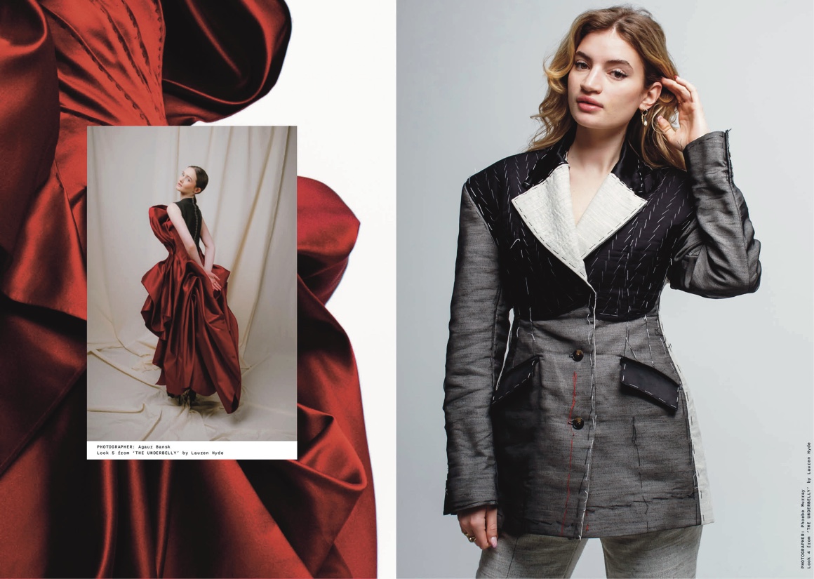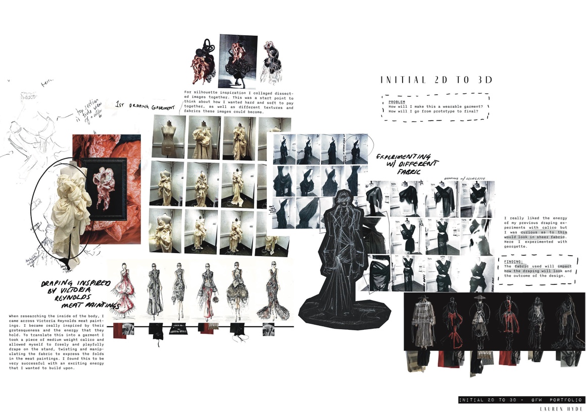 THE UNDERBELLY was born from my research of ‘The String of Pearls: A Domestic Romance’ and its movie adaptation ‘Sweeney Todd: The Demon Barber of Fleet Street’. I investigated dissection of the body, body snatching and the impact of the 1832 Anatomy act, highlighting the co-modification of the human body both past and present. In relation to fashion, I dissected physical garments and the industry, revealing a loss of appreciation of skill, apparent in our mistreatment of workers and high consumption.