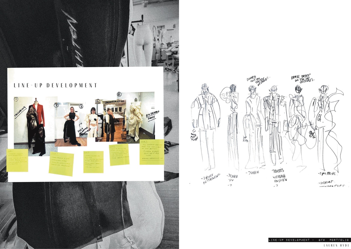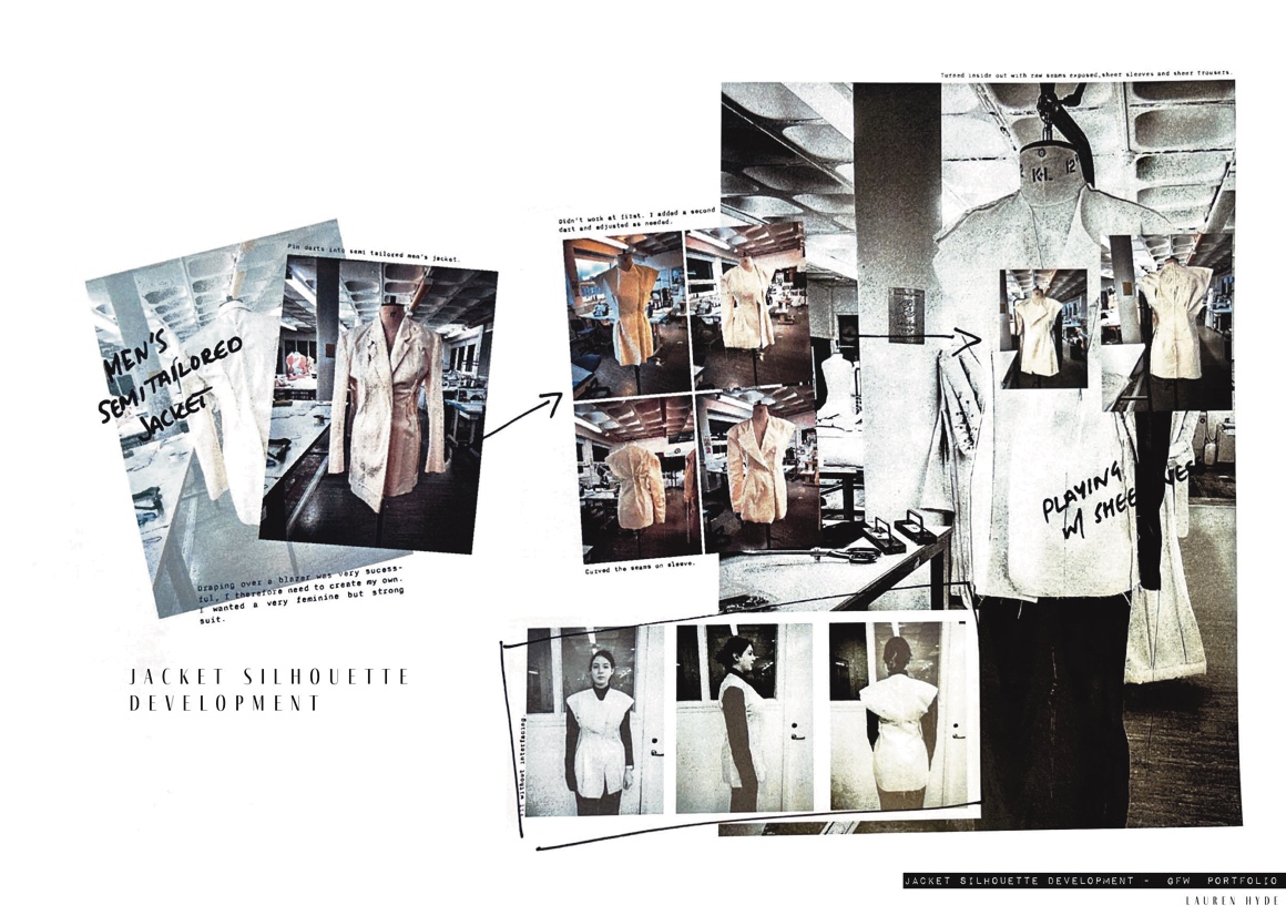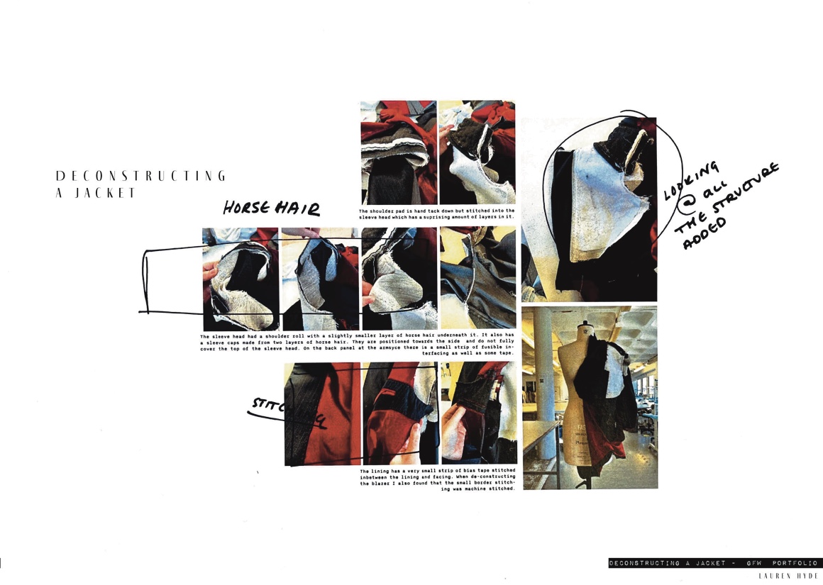 I researched deconstructed fashion as it highlights craftsmanship, challenges notions of beauty and the function and meaning of fashion, which I believe can challenge our views around consumption. I explored methods of construction and manufacture, informed by the techniques used in couture and bespoke tailoring. Through utilising textiles that often go unseen, and their importance unacknowledged, in combination with other design decisions the collection takes on a deconstructed approach.