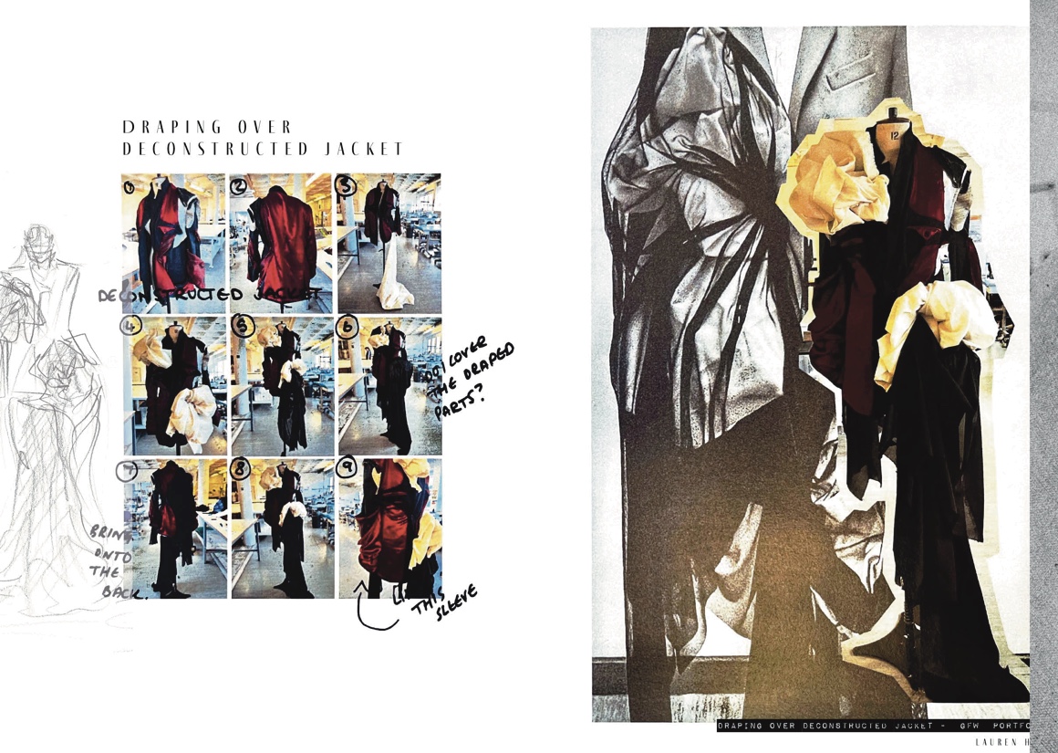 Inspired by their grotesqueness and energy I wanted to translate this into a garment, as such I took a piece of calico and allowed myself to drape freely and playfully on the stand. I found this to be very successful with an exciting energy that I wanted to build upon. I developed and experimented with draping techniques and fabrics throughout the project, colliding it with tailoring to create different garments and silhouettes. Throughout the manufacturing process it was important to me that my method was in line with my philosophy. As such the process relied heavily on traditional techniques used in couture and tailoring. Through my research into tailoring, I discovered the important of hand stitching and tacking to produce accurate and durable results. I therefore utilised machine and hand stitch where appropriate in order for me to produce the best results.